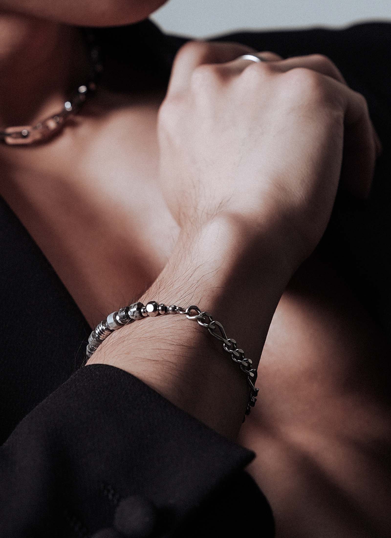 สร้อยข้อมือผู้ชาย รุ่น CARBON LINK จาก DANDY COSMO ออกแบบด้วยการผสานระหว่างโซ่สแตนเลสสตีลดีไซน์เรียบ และหินโทนเทาเข้ม ให้ลุคสุขุม ดิบ และทันสมัย ตัวงานเน้นความสมดุลของพื้นผิวโลหะและหินธรรมชาติ สะท้อนคาแรกเตอร์ของผู้ชายที่ชอบความ เรียบ เท่ ไม่หวือหวา แต่ดูมีดีเทล เหมาะสำหรับใส่ได้ทุกวัน และแมตช์กับสไตล์มินิมอล สมาร์ทแคชวล หรือสตรีทสุภาพได้อย่างลงตัว