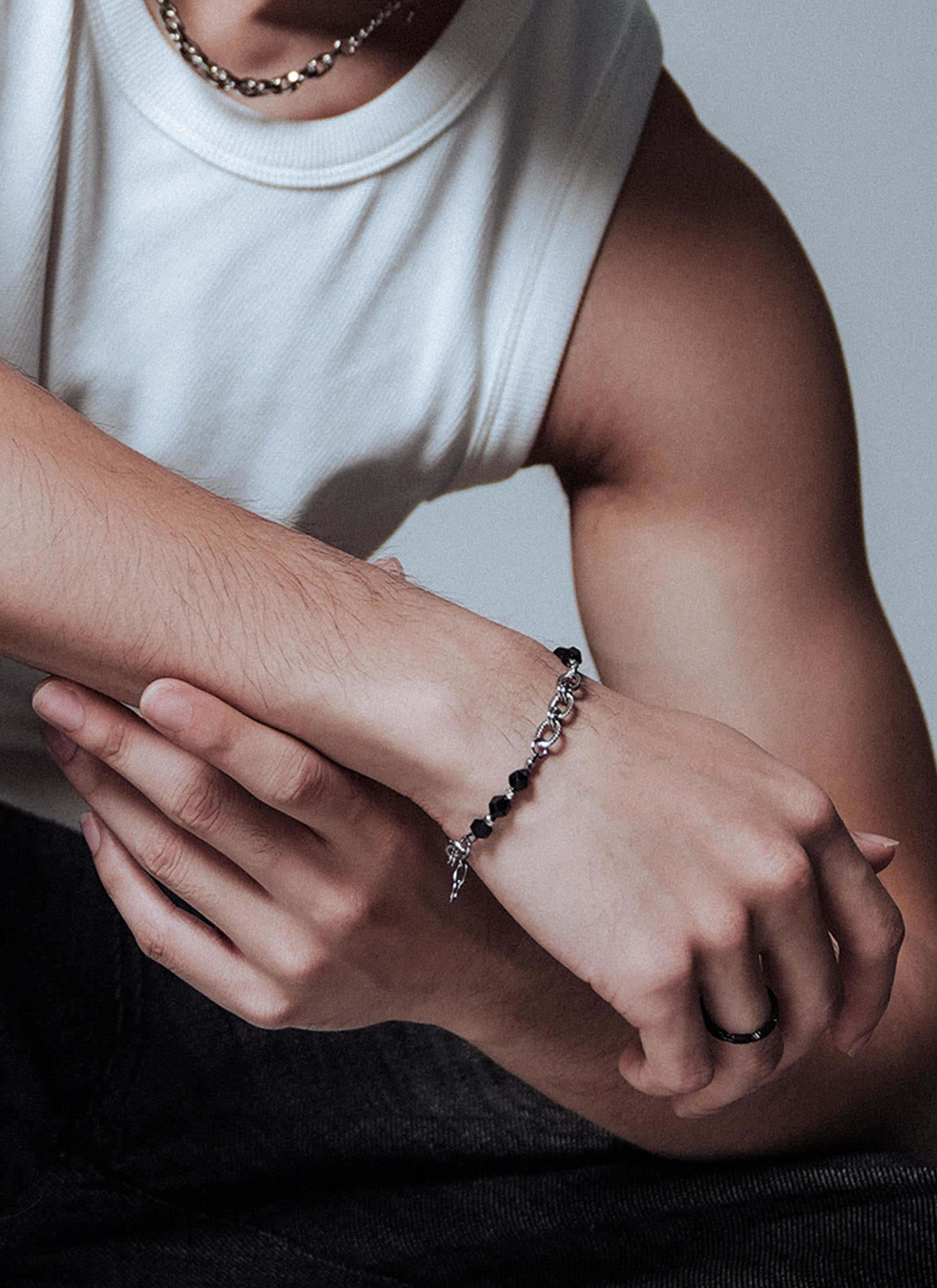 ดีไซน์โดดเด่นด้วยการผสานระหว่างโซ่สแตนเลสสตีลผิวบิด และหินโทนดำด้าน ให้ลุคเข้ม เท่ และสุขุม ตัวงานเน้นความคอนทราสต์ระหว่างโลหะสีเงินกับหินสีดำ สร้างภาพลักษณ์ที่นิ่ง มั่นคง และมีพลังในแบบผู้ชายยุคใหม่ เหมาะสำหรับผู้ที่ชอบเครื่องประดับเรียบแต่มีคาแรกเตอร์         ชัด ใส่แล้วเสริมลุคให้ดูคม เท่ และมีสไตล์ในทุกวัน
