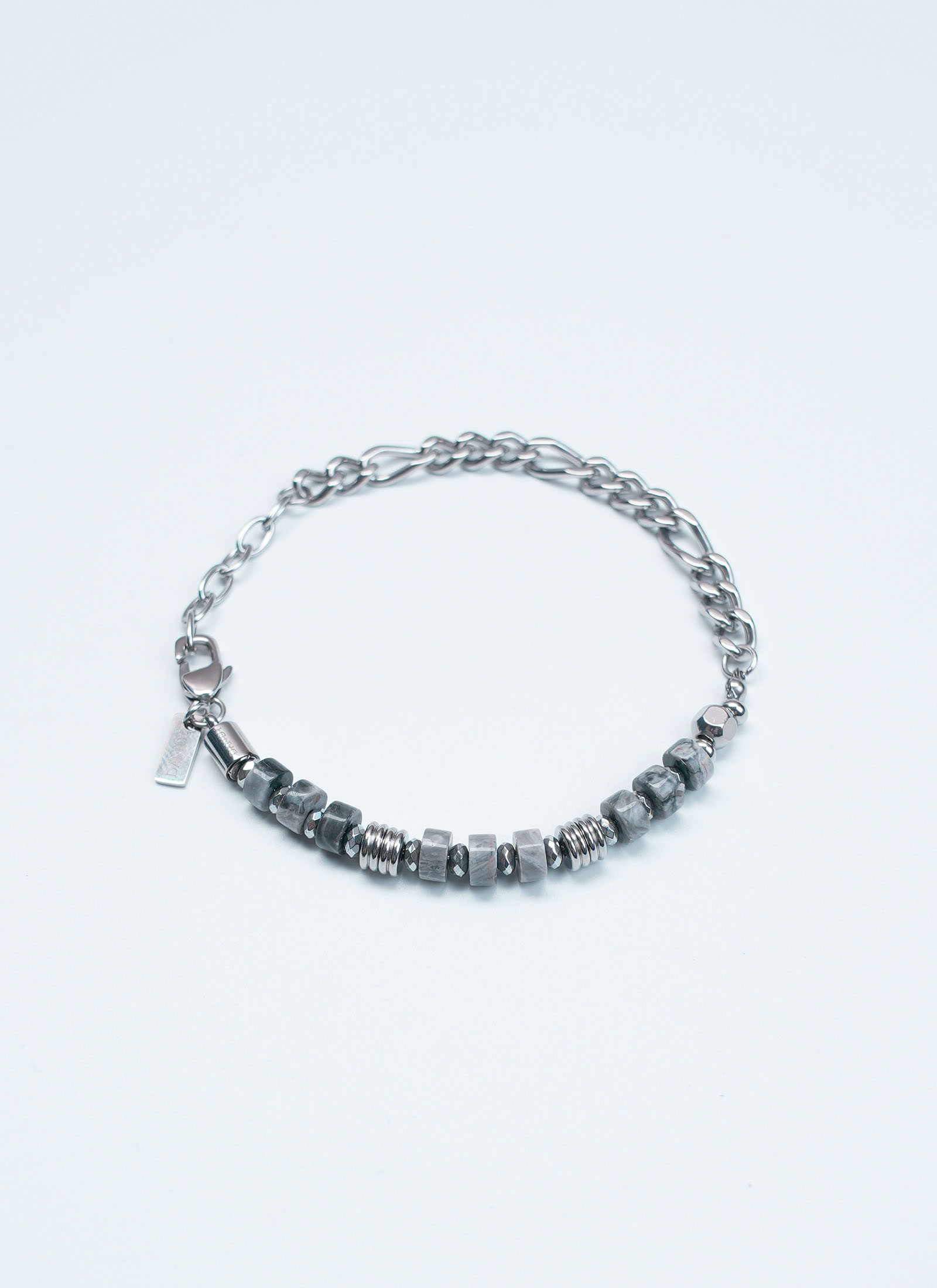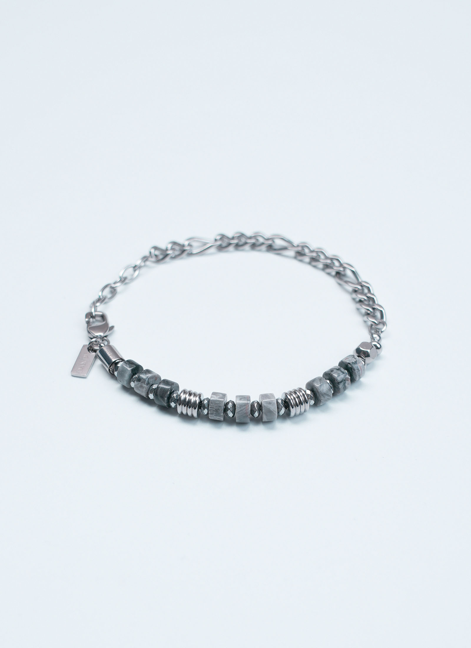 สร้อยข้อมือผู้ชาย รุ่น CARBON LINK จาก DANDY COSMO ออกแบบด้วยการผสานระหว่างโซ่สแตนเลสสตีลดีไซน์เรียบ และหินโทนเทาเข้ม ให้ลุคสุขุม ดิบ และทันสมัย ตัวงานเน้นความสมดุลของพื้นผิวโลหะและหินธรรมชาติ สะท้อนคาแรกเตอร์ของผู้ชายที่ชอบความ                 เรียบ เท่ ไม่หวือหวา แต่ดูมีดีเทล เหมาะสำหรับใส่ได้ทุกวัน และแมตช์กับสไตล์มินิมอล สมาร์ทแคชวล หรือสตรีทสุภาพได้อย่างลงตัว