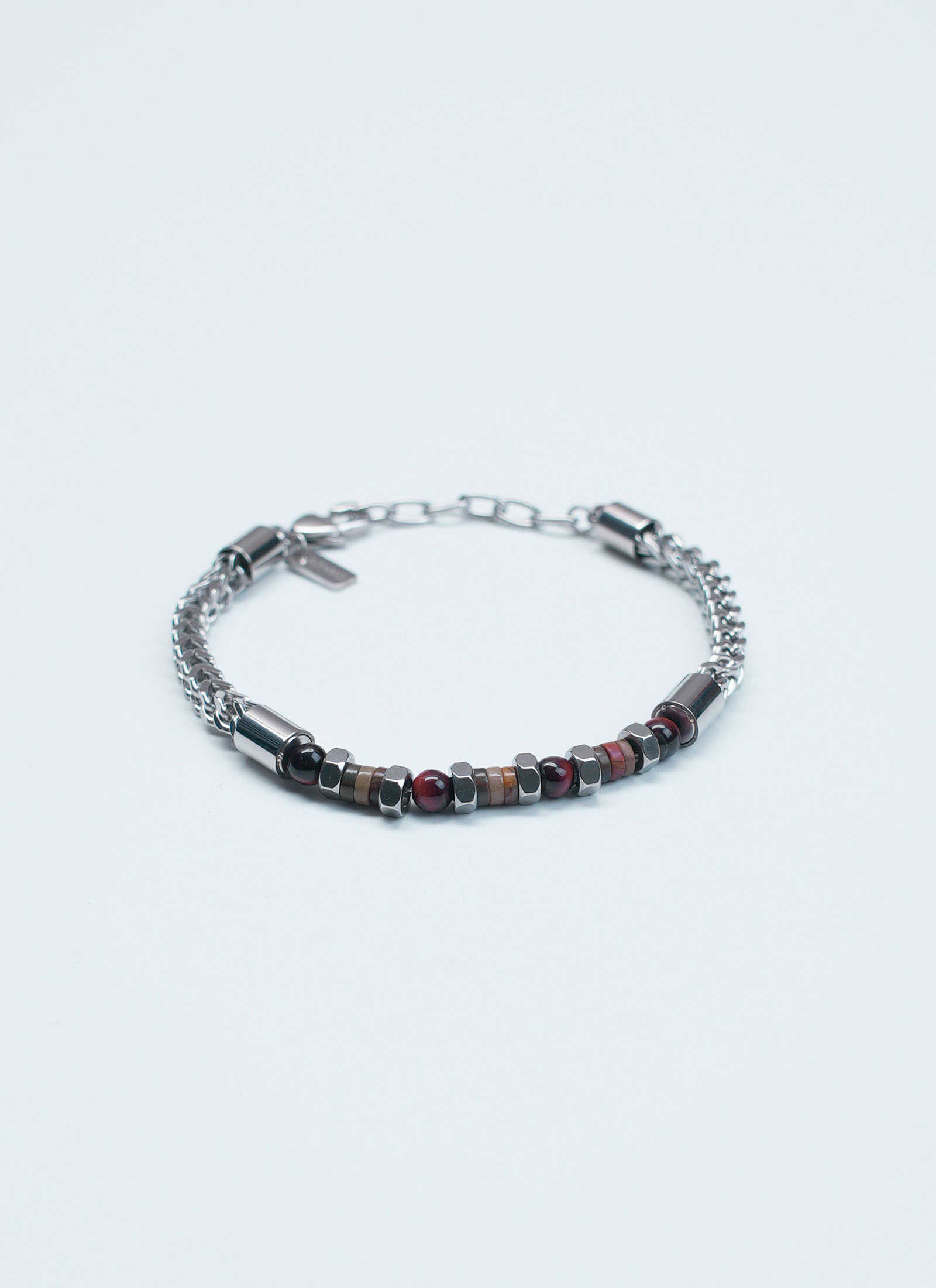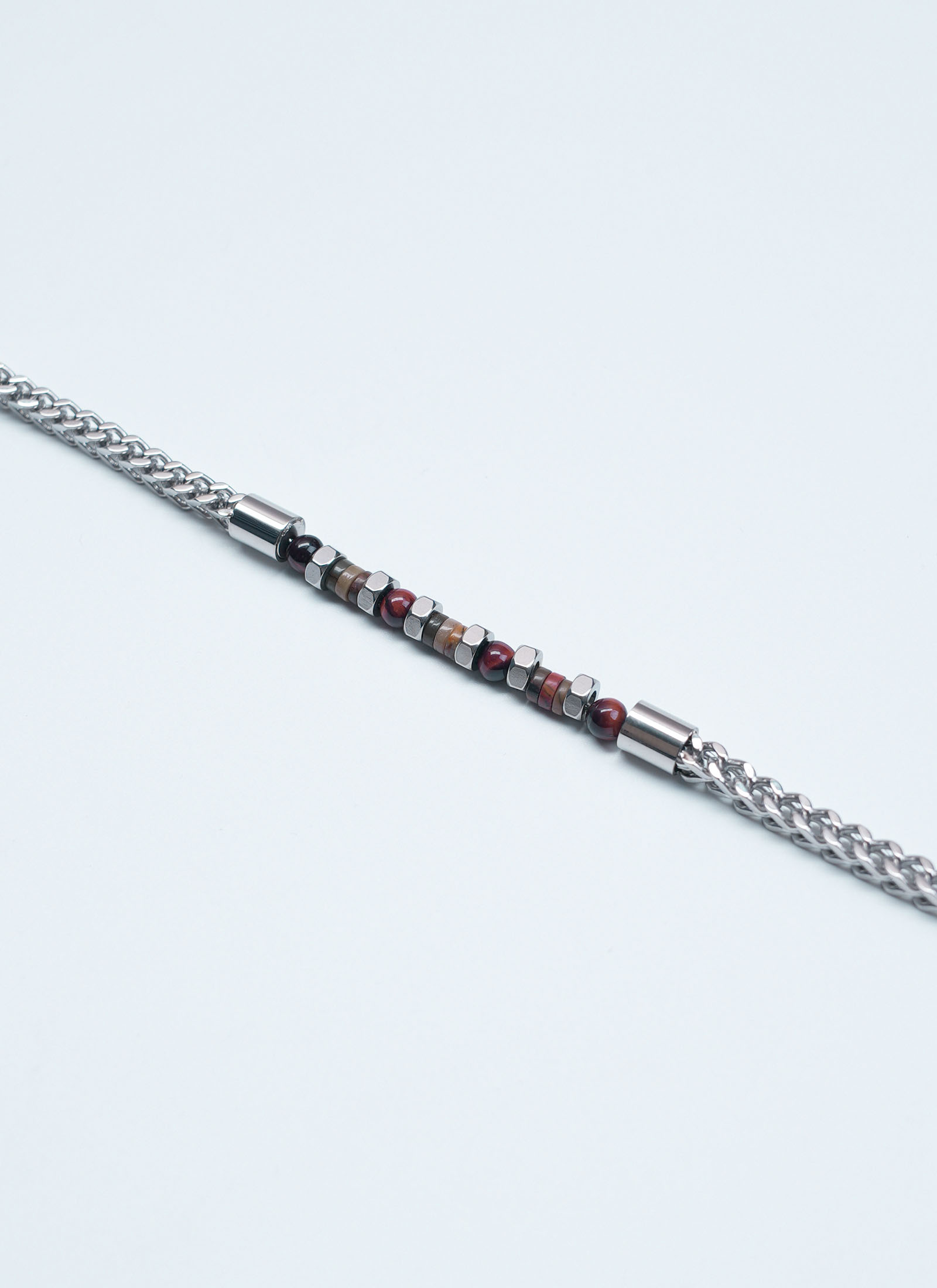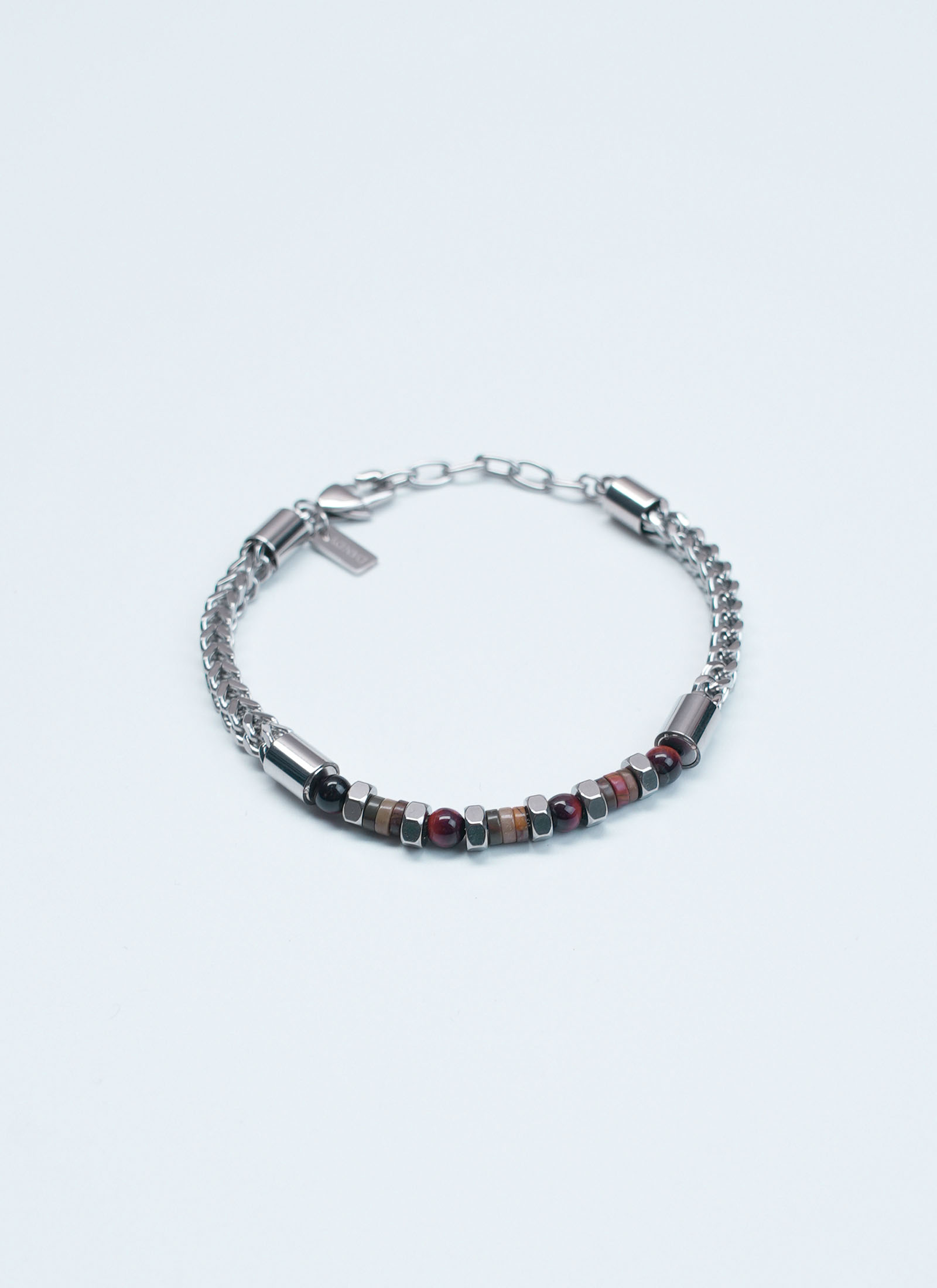 ออกแบบด้วยการผสานระหว่างโซ่สแตนเลสสตีลคุณภาพสูง และหินโทนน้ำตาลเข้ม ให้ลุคสุขุม แข็งแรง และมีคาแรกเตอร์ ตัวงานเน้นความสมดุลระหว่างความดิบของโลหะกับความอบอุ่นจากหินธรรมชาติ สื่อถึงความนิ่ง มั่นคง และความเท่ในแบบผู้ชายยุคใหม่ เหมาะสำหรับ              ใส่ในชีวิตประจำวัน หรือเพิ่มลูกเล่นให้ลุคสมาร์ทแคชวลและสตรีทสุภาพได้อย่างลงตัว