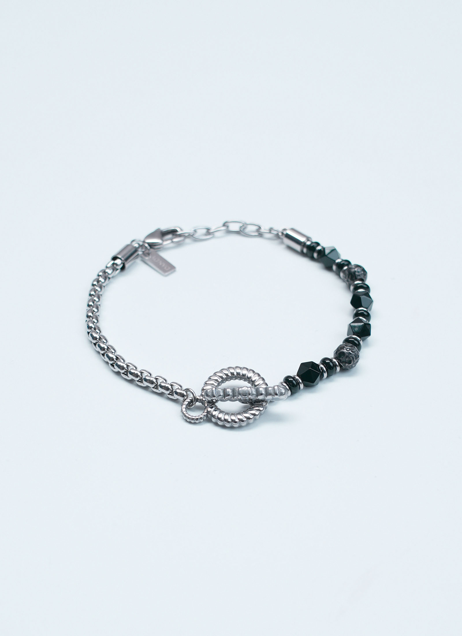 ออกแบบด้วยการผสานระหว่างโซ่สแตนเลสสตีลดีไซน์คลาสสิก กับหินโทนดำเข้มที่คัดเลือกอย่างพิถีพิถัน เสริมด้วยดีเทลโลหะทรงบิดที่โดดเด่น สื่อถึงความหนักแน่น ความมั่นคง และความเป็นผู้นำอย่างมีรสนิยม ตัวงานให้ลุคเข้ม สุขุม แต่แฝงด้วยความหรู เหมาะสำหรับ        ผู้ชาย  ที่ชอบเครื่องประดับมีคาแรกเตอร์ชัด ใส่แล้วเสริมบุคลิกให้ดูนิ่ง เท่ และทรงพลังในทุกโอกาส